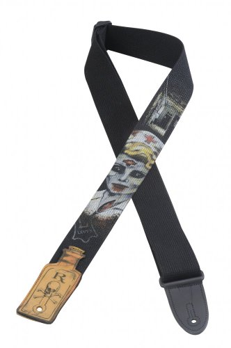 2-inch cotton guitar strap with printed zombie design, leather ends and tri-glide adjustment. The end piece is printed and shaped to complement the design.